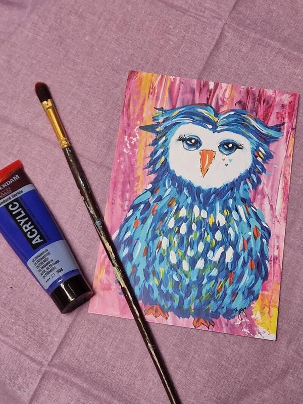 Een blauw uiltje op een kleurige roze achtergrond, daar wordt je toch blij van?