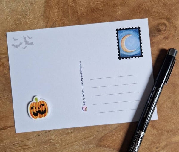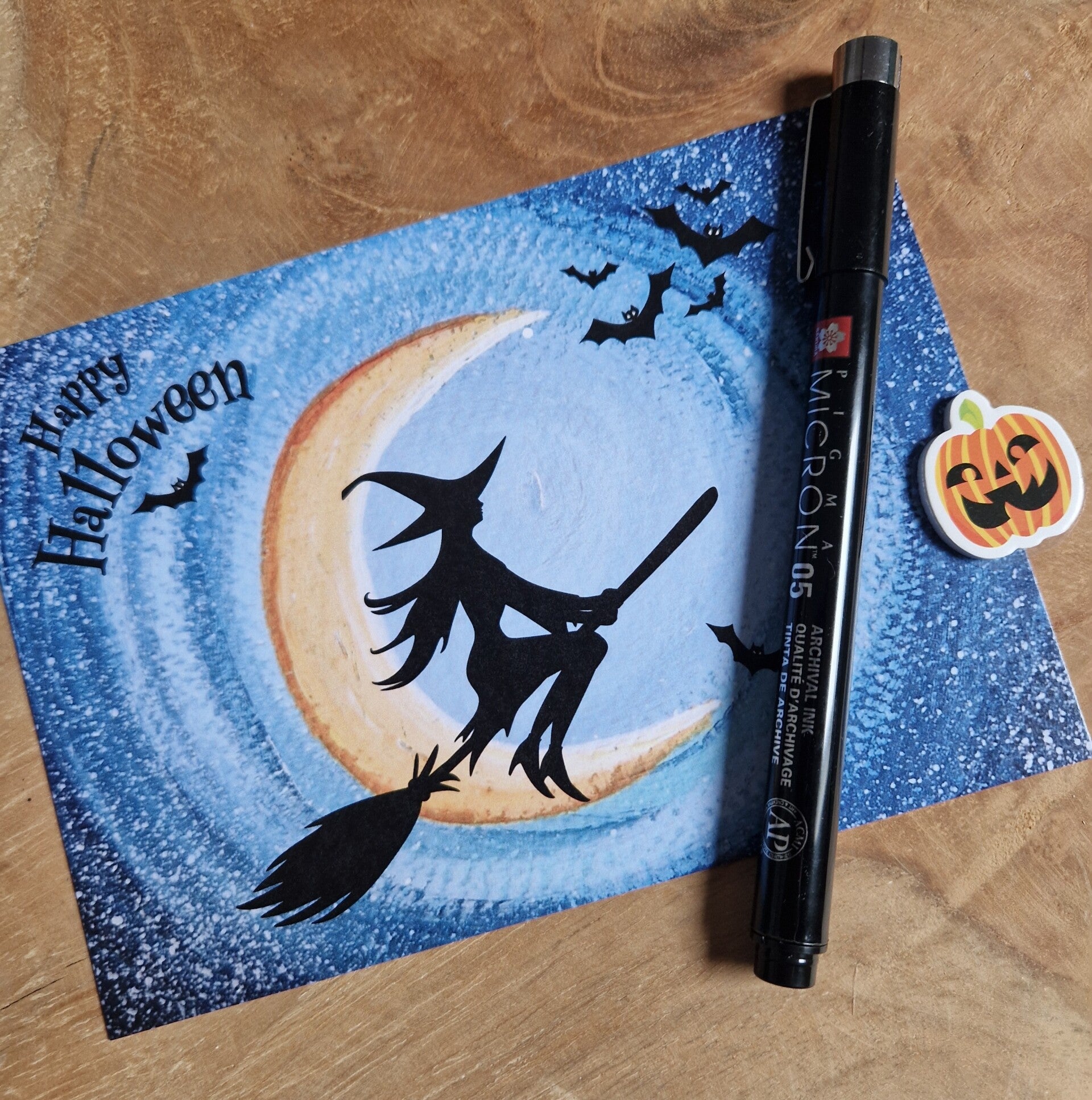 Met dit vliegende heksje wens je elkaar een fijne Halloween.