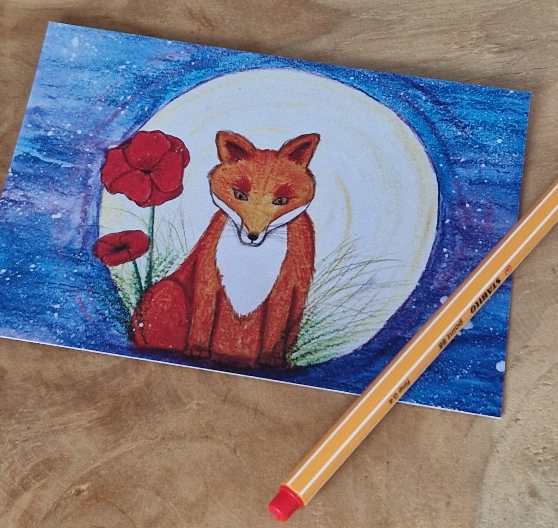 Vos voor de maan, met ernaast 2 prachtige klaprozen