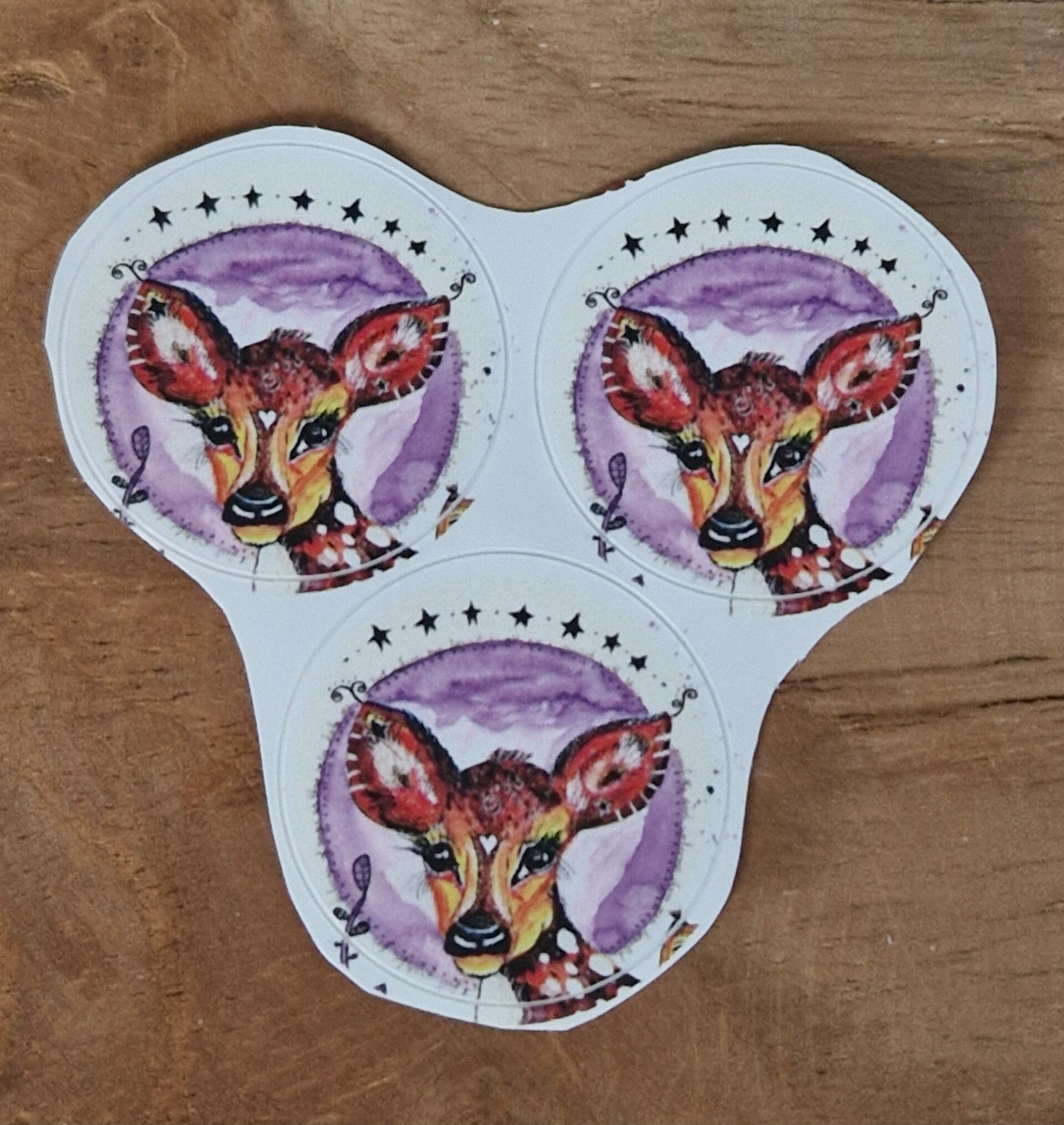 Zijn ze niet schattig, deze Bambi stickers? Rond, 3cm doorsnee. Per 3 stuks op een folie.