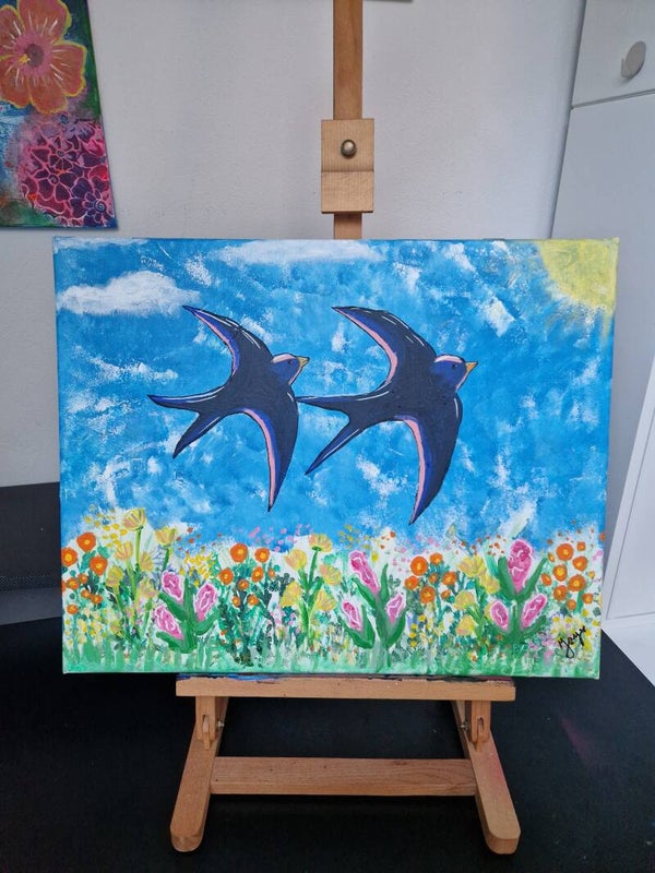 De zwaluwen vliegen boven een zee van bloemen, de zon tegemoet.