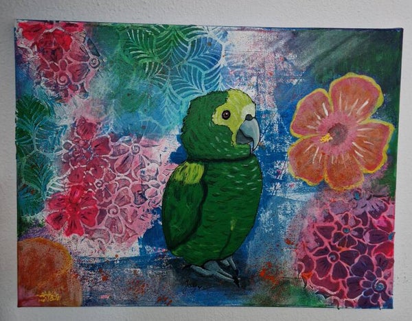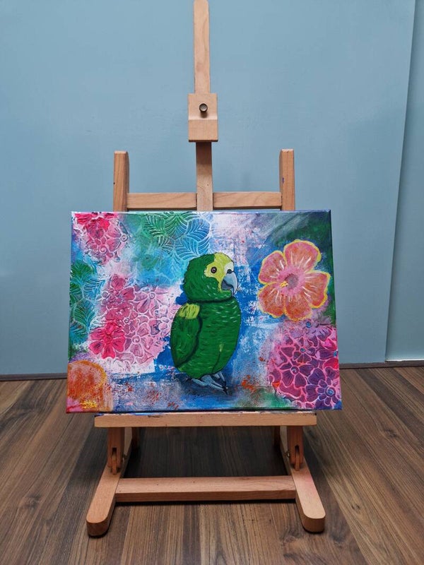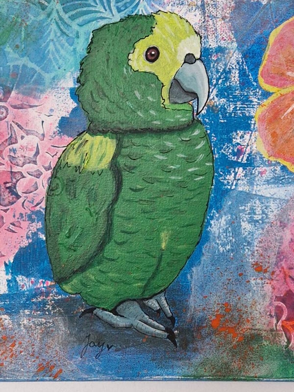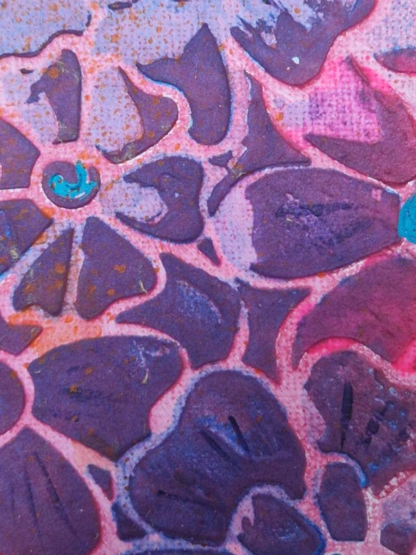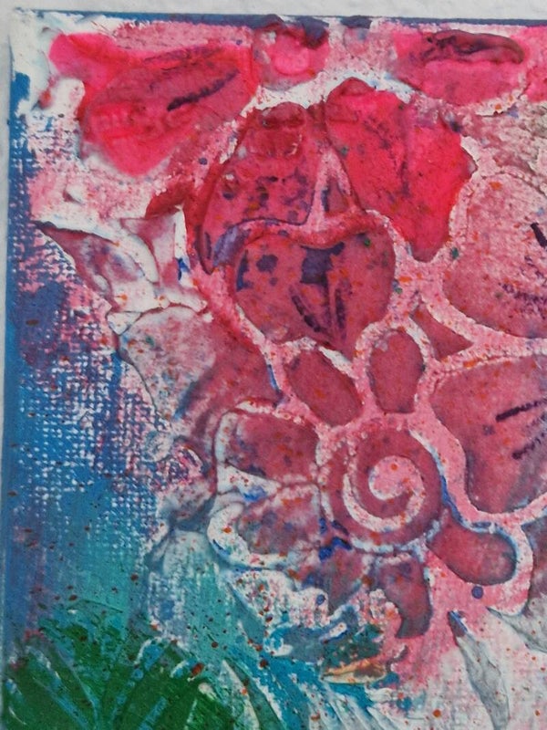 Dit vrolijke kleurrijke mixed media werk op linnen meet zo'n 40 x 30 cm. Het is vol textuur en levendigheid.